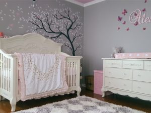 Other accessories include a white pile rug with grey harlequin diamonds in the weave, pretty pink cushions and matching ivory, pink and grey soft toys and a few other butterfly-themed knick-knacks placed strategically around the room. An eye-catching lamp rests upon the nightstand and and an even more eye-catching crystal chandelier hangs from the center of the ceiling. The other functional accessories include pink-clad and grey bins and baskets placed appropriately.